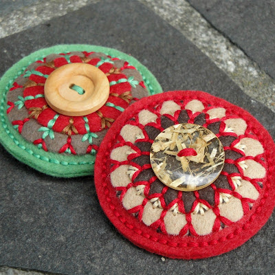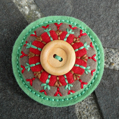 Tak mám zase dvě brožky-mandalky k nakouknutí. Dělám je nejraději. Vždycky vyberu první barvy, pak knoflíček a bavlnky a začnu vyšívat. Nikdy dopředu nevím, jak budou vypadat, prostě vyšívám a nechám ruku vést, kam se jí zlíbí. A podle ohlasů vím, že se líbí i ostatním... jsem zato moc ráda :).