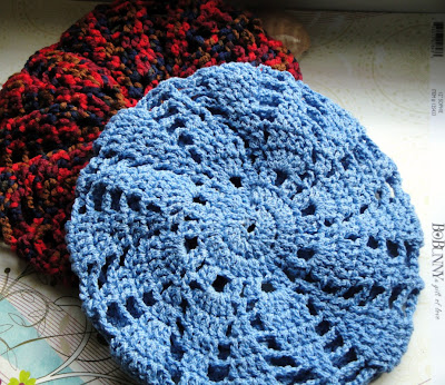 ... ať se neřekne, že nic nedělám :). Dodělala jsem od loňska načaté háčkované baretky. Jelikož jsou malé a já nemám po ruce žádnou malou modelku, fotila jsem, jak to šlo. A pokud někde vypátrám návod, podle kterého jsem je háčkovala, tak doplním taky. Modrá je z příjemné froté příze a barevná z ploché stužkové bavlněné příze.